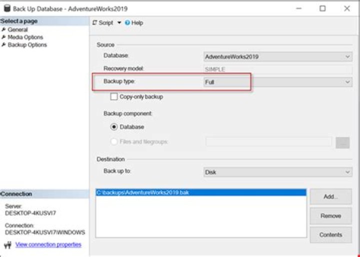 - Step 3: The Backup dialog box appears; to create a database backup.