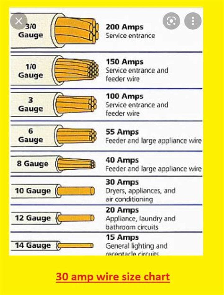 A 20-amp 240-volt circuit calls for 12-gauge wire; a 30-amp circuit calls for 10-gauge wire; a 40-amp circuit calls for 8-gauge wire; and a 50-amp circuit calls for 6-gauge wire.
