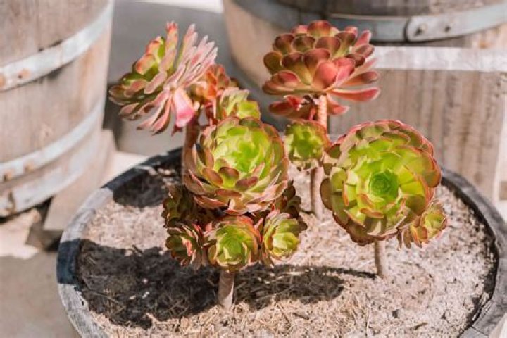 “When aeoniums get leggy, cut off the tops, leaving an inch or two of stem, and throw the rest of the plant away, roots and all. Replant each rosette as a cutting.
