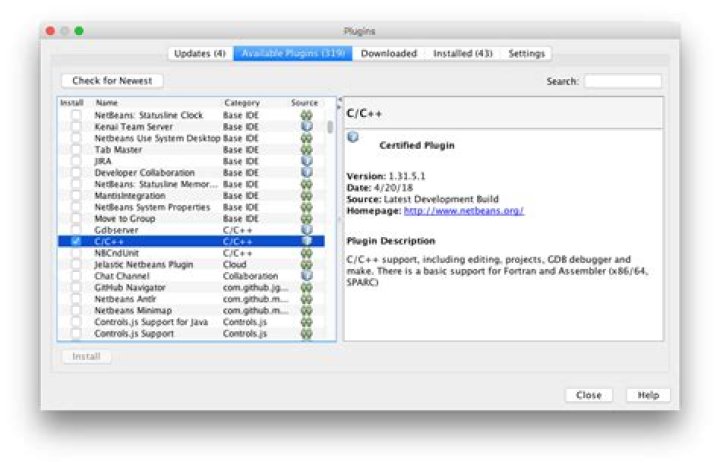Install the C/C++ plugin in NetBeans. In NetBeans, go to Tools → Plugins. Then in Available Plugins, in the C/C++ category, check the box for C/C++, then click Install to start the installation.