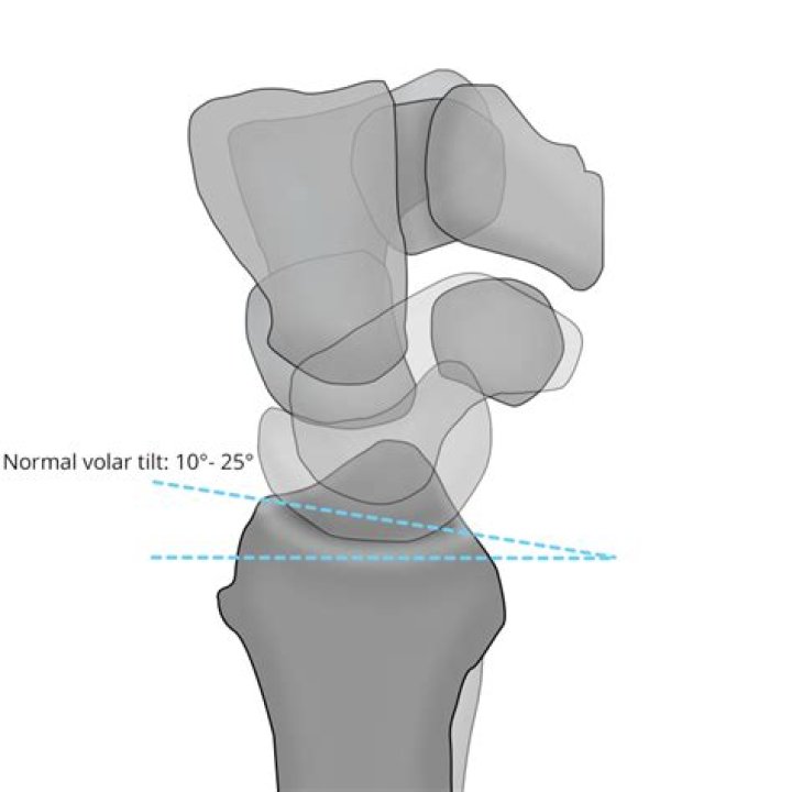 The volar tilt, or volar inclination, is measured on the lateral view. A line perpendicular to the long axis of the radius is drawn, and a tangent line is drawn along the slope of the dorsal-to-volar surface of the radius. The normal angle is 10-25º.