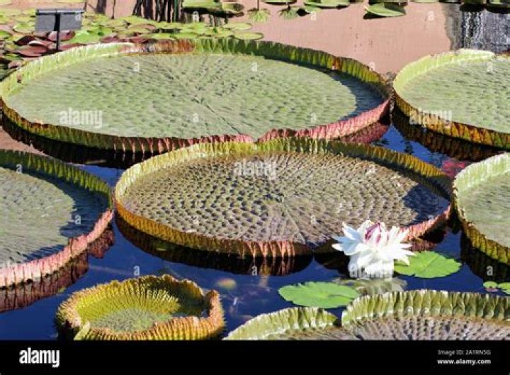 The giant water lily’s leaves may grow as large as 8 to 9 feet in diameter, and a very large pad is capable of supporting up to 100 pounds of weight.