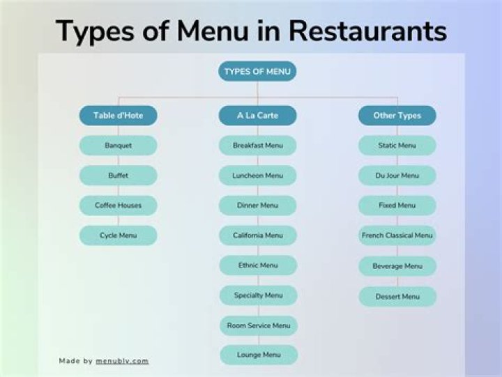 What is the types of menu?The five types of menus most commonly used are a la carte menus, static menus, du jour menus, cycle menus, and fixed menus.
