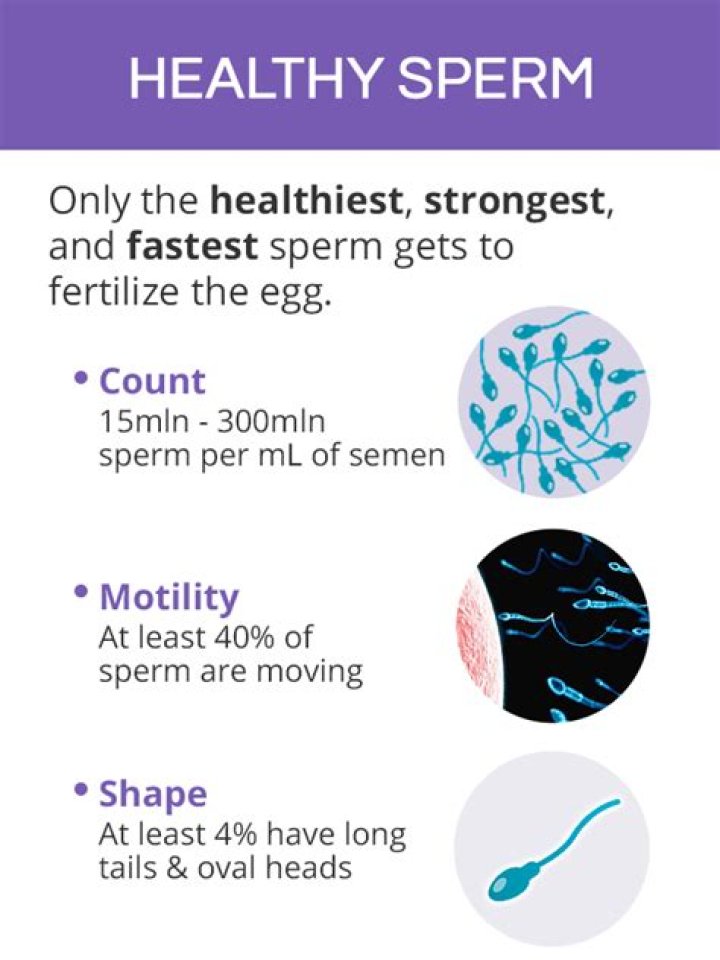 Sperm count: at least 20 million per milliliter (m/mL) Sperm motility, or the ability to move rapidly: 60% to 80% actively moving. Sperm morphology, or the sperm’s shape and size: 70% to 90% normally shaped.