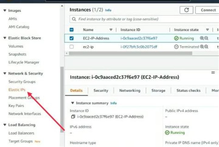- Under the Network & Security tab, choose Elastic IPs.