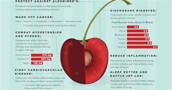 Cherries contain a number of beneficial nutrients, such as vitamin C and antioxidants. Some evidence suggests that they may also help lower inflammation, protect heart health, and improve sleep as part of a healthy diet.
