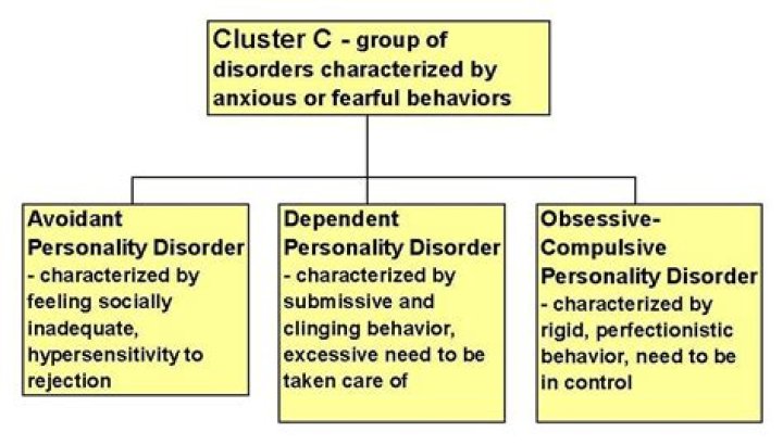 Cluster C personality disorders are characterized by anxious, fearful thinking or behavior. They include avoidant personality disorder, dependent personality disorder and obsessive-compulsive personality disorder.
