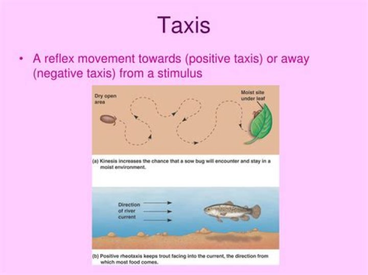 Taxis is a form of movement behavior that involves movement towards or away from a stimulus. This movement can be in response to light, known as phototaxis; chemical signals, known as chemotaxis; or gravity, known as geotaxis—among other stimuli.Are Pillbugs taxis or kinesis?