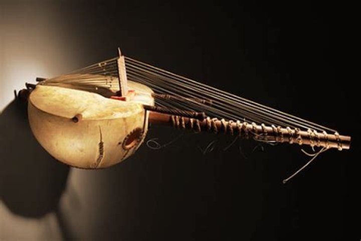 Its strings are plucked. An ancient harp-like string instrument. A small, stringed instrument of the lute family. It has a pear shaped body, strings in four pairs and a neck similar to a guitar.