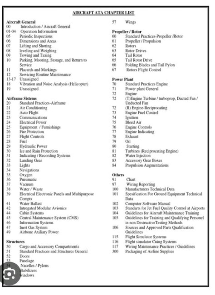 This mission is what helped spark the ATA chapters list, allowing for a comprehensive guide and numbering system to provide guidelines for technical manuals. The ATA Chapters list is widely used by many airliners in order to assist in maintenance for their in-service parts and components.