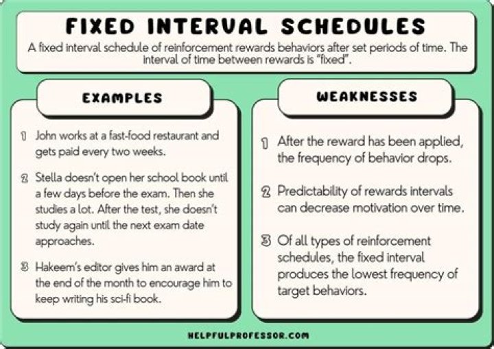 A Fixed Interval Schedule provides a reward at consistent times. Forexample a child may be rewarded once a week if their room is cleaned up. Aproblem with this type of reinforcement schedule is that individuals tend to wait until the time when reinforcement will occur and thenbegin their responses (Nye, 1992).