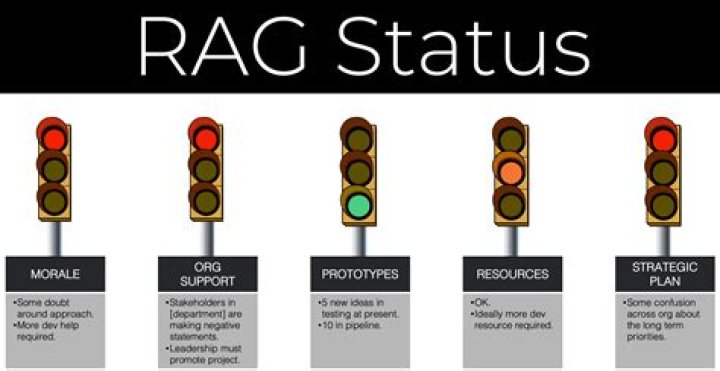 The RAG system is a popular project management method for rating status reports. Basically, it’s based on traffic lights using red, amber (yellow), and green to signify different scale ratings. … Project managers use a RAG rating to indicate if a project is on track or at risk.