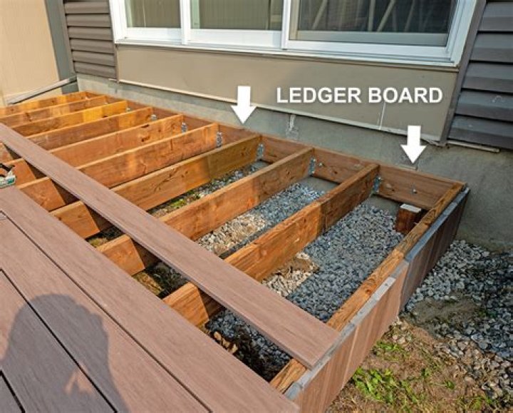 A ledger board is a horizontal lumber beam attached to an existing wall and used to tie in construction elements such as porch roofs and decks. A deck ledger is installed as part of the deck frame construction. The frame is then attached at either end, with the deck joists butting up to it.