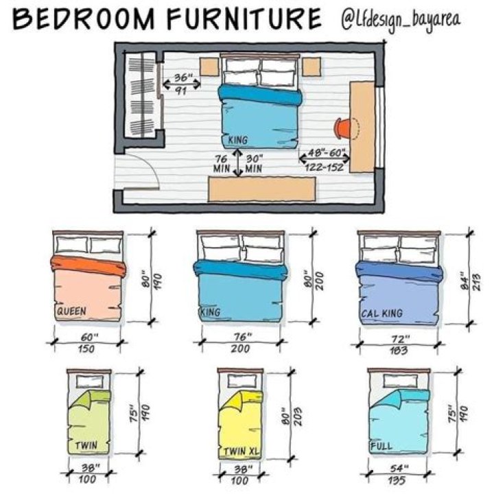 Bedrooms with Full Size | Double beds should have minimum areas of around 97 ft2 (9 m2) for a bed with clearance, to between 118-121 ft2 (11-11.2 m2) for bed clearance and closets.