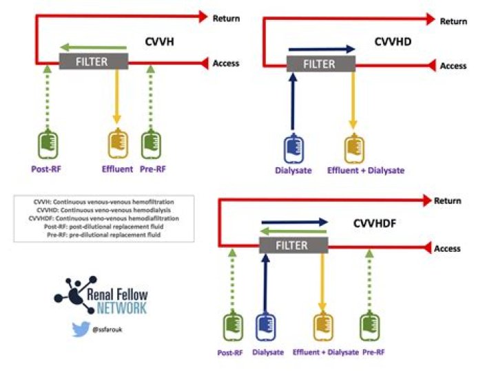 Continuous veno-venous hemodiafiltration (CVVHDF) uses replacement fluid and dialysate. CVVHDF combines the benefits of diffusion and convection for solute removal. Top of page. Anticoagulation is needed to reduce the clotting of blood in the blood tubing set and filter.