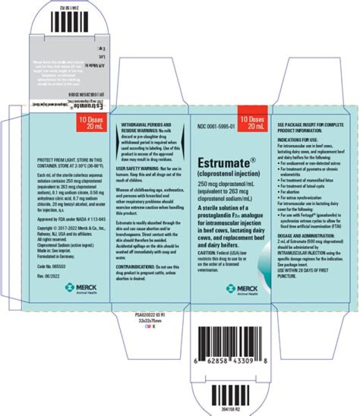 DOSAGE AND ADMINISTRATION: Two ml of Estrumate (500 mcg of cloprostenol) should be adminis- tered by INTRAMUSCULAR INJECTION for all indications in both beef and dairy cattle. Do not puncture stopper more than 10 times.