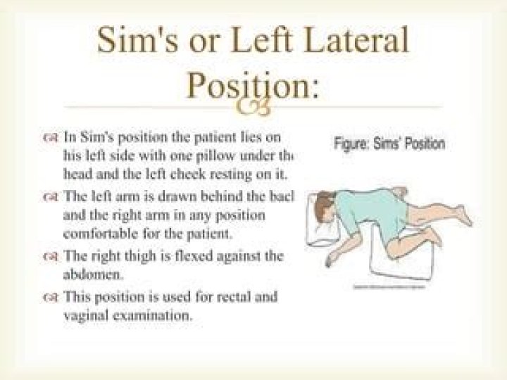 Position the patient on left side, lying with the knees drawn to the abdomen (Fig 2). This eases the passage and flow of fluid into the rectum. Gravity and the anatomical structure of the sigmoid colon also suggest that this will aid enema distribution and retention.How does Sims position differ from side lying position?