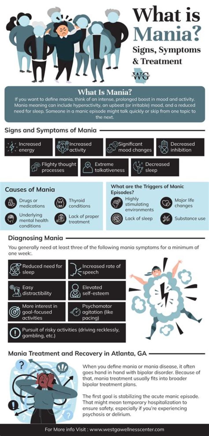 A manic episode is characterized by a sustained period of abnormally elevated or irritable mood, intense energy, racing thoughts, and other extreme and exaggerated behaviors. People can also experience psychosis, including hallucinations and delusions, which indicate a separation from reality.