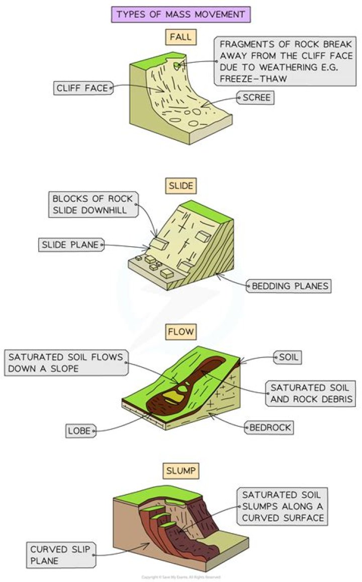 Damp soil moves very slowly down the slope as the weight of water pushes it forwards. Rain splash may release soil grains that fall further downslope. Landslides arise when rocks and unconsolidated material on the cliff face are saturated with water (rain or wave-splash). Eventually the material slips down the slope.
