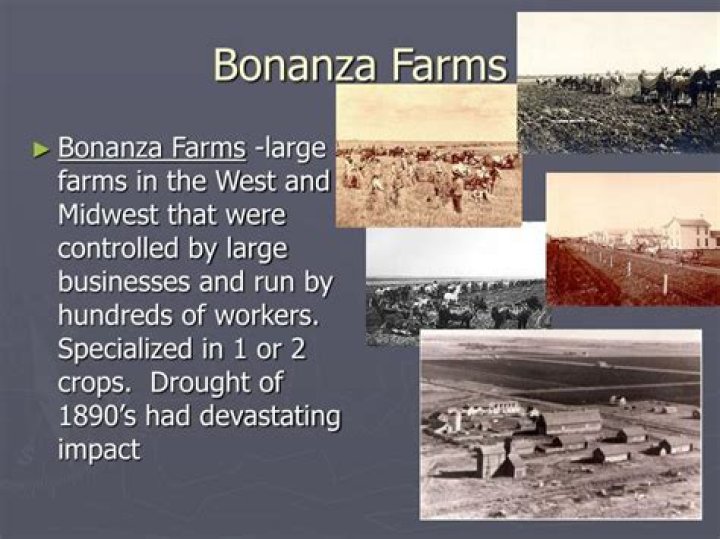 Bonanza farms were very large farms established in the western United States during the late nineteenth century. They conducted large-scale operations, mostly cultivating and harvesting wheat. … Most bonanza farms were owned by companies and run like factories, with professional managers.