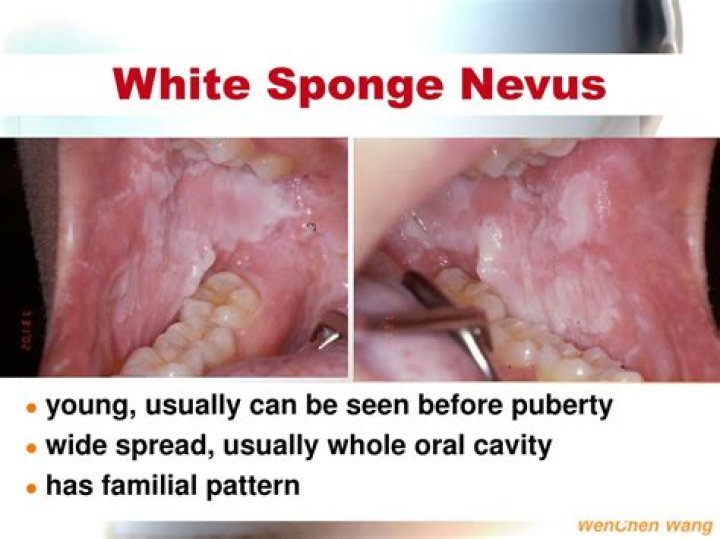 White sponge nevus is a condition characterized by the formation of white patches of tissue called nevi (singular: nevus) that appear as thickened, velvety, sponge-like tissue. The nevi are most commonly found on the moist lining of the mouth (oral mucosa), especially on the inside of the cheeks (buccal mucosa).