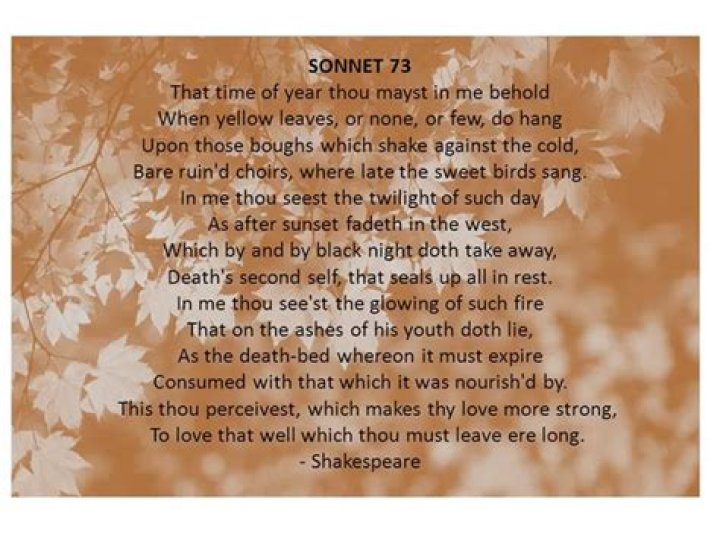Sonnet 73, one of the most famous of William Shakespeare’s 154 sonnets, focuses on the theme of old age. The sonnet addresses the Fair Youth. Each of the three quatrains contains a metaphor: Autumn, the passing of a day, and the dying out of a fire. Each metaphor proposes a way the young man may see the poet.