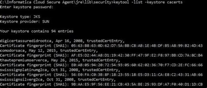 - On a Windows system, at the prompt, type: keytool -list -keystore “c:\Program Files (x86)\Java\jre<version>\lib\security\cacerts.