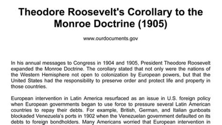 The Roosevelt Corollary was a United States foreign policy established by President Theodore Roosevelt in 1904. It stated that the U.S. would intervene in Latin American countries where European powers sought to collect debts or whose governments were thought to be unstable.