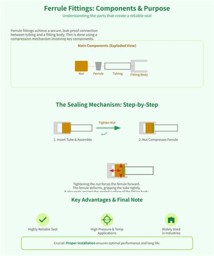 Double ferrule compression fittings feature an outer nut, two deformable ferrules in soft alloy or non-ferrous metals and, a tube fitting body and are available for metric and fractional tube sizes. When the fitting nut is screwed on the tube, the ferrules get deformed to create a tight seal.